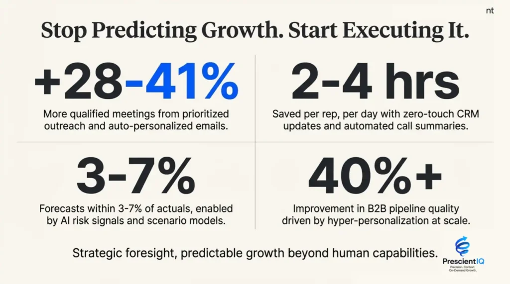 PrescientIQ shifts your sales model from “manual execution” to “autonomous execution,” directly reducing the labor hours required to acquire a customer. Eliminates “Grunt Work”: The platform saves 2-4 hours per rep, per day by automating zero-touch CRM updates and call summaries. Reduces Fixed Costs: By replacing manual, repetitive marketing and sales labor with an intelligent multi-agent infrastructure, you avoid the high fixed OpEx associated with traditional manual execution. Scales Without Headcount: It allows you to scale revenue without increasing headcount in a linear fashion, effectively decoupling growth from labor costs.
